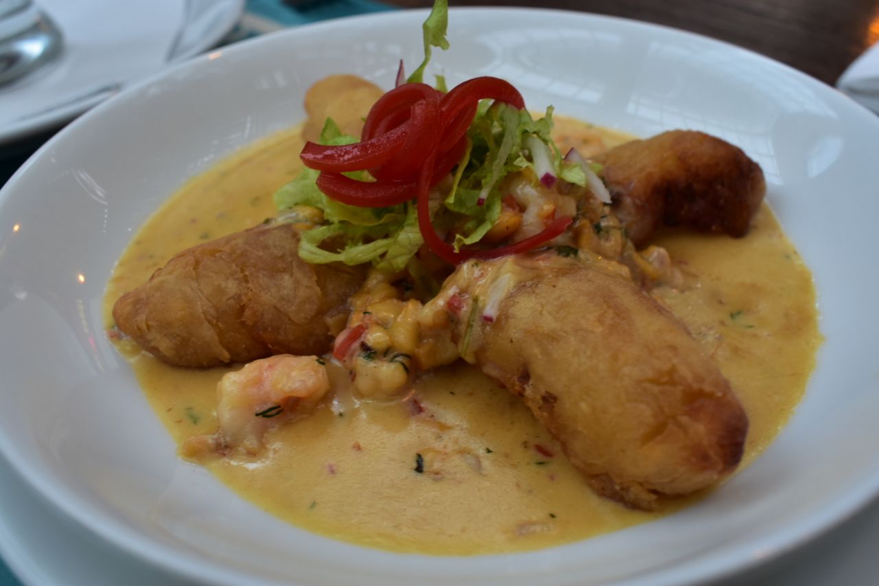 - The Carimañola de Puerto Colombia: a yuca breaded shrimp and Costeño cheese starter, topped with a garnish of red pepper- one of the show stopping appetisers. Photo: Karen Walker