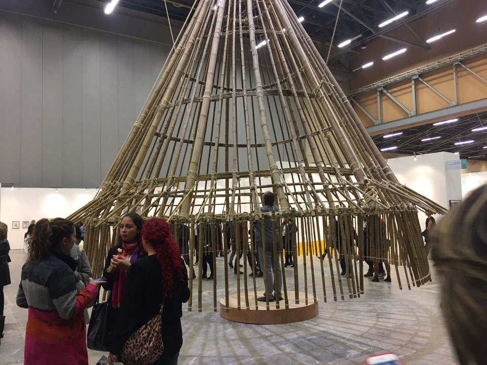 One of the outstanding works of the Sitio section was ‘Conic’ by the artist Tania Candiani. It welcomed visitors to ARTBO with a wood and fiber solid structure made with traditional methods of the ancestral Kogi architectural construction.