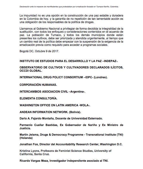 On October 9 deputy Attorney General María Paulina Riveros confirmed that the October 5 clash between armed forces and unarmed farmers in El Tamil, near Tumaco, had left a total of 6 confirmed deaths and 12 people injured.
