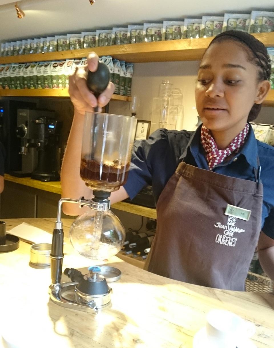 - Juan Valdez barista demonstrates the syphon method of brewing coffee.